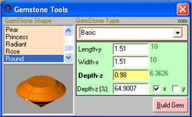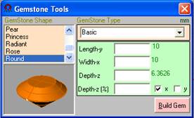 2. Enter the length (y-axis), width (x-axis), and depth (z-axis) of the desired gemstone size. Note that gemstone depth can be entered as a measurement or as a percentage of the gemstone length or width. If the check is in the box near the X the depth percentage will be of the width and if the box near the Y is check it will be of the length.