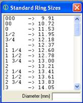 The ring sizes tool allows the user to quickly and easily create a circle with a diameter of the selected ring size. American standard ring sizes are on left and their corresponding diameters are on the right. Double click on the desired ring size to create the ring size circle. Sizes included are from 000 through 15.