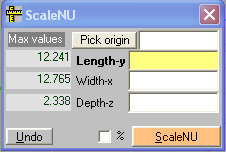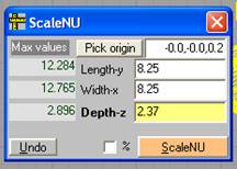1. Click the Scale by Dimension/Percentage button and the dialog opens. Once an object(s) is selected the maximum x,y,z values will appear in the left hand rows.